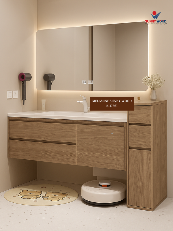 Một trong những lý do khiến sản phẩm này được ưa chuộng là khả năng mô phỏng vân gỗ. Công nghệ phủ Melamine hoặc film vân gỗ tạo ra bề mặt sắc nét, màu sắc đa dạng và cảm giác thị giác tương tự gỗ thật. Nhờ đó, người dùng vẫn có được không gian sang trọng mà không gặp các rủi ro thường thấy của vật liệu gỗ trong phòng tắm. Đây là yếu tố khiến sản phẩm được ưa chuộng rộng rãi.